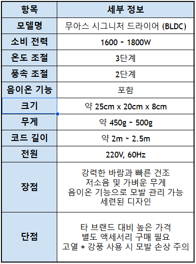- 단점: 상대적으로 높은 가격, 별도 액세서리 구매 필요, 특정 온도/바람 설정 시 모발 건조 주의 필요